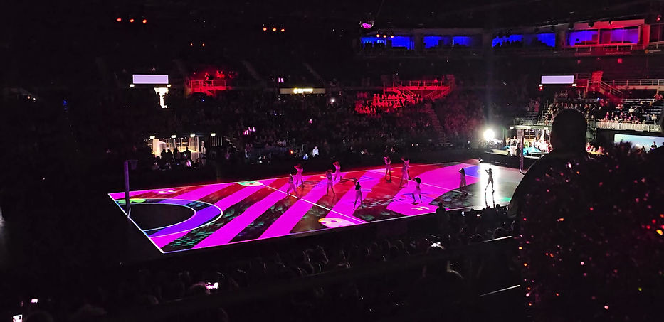 Large scale projection mapping project. 4x 20k Bargo projectors pointed down at the netball court. We worked with the dancing choreography to create a visual show that interacted with the dancers. We also created some custom scenes to show on the LED screens for some song performances.